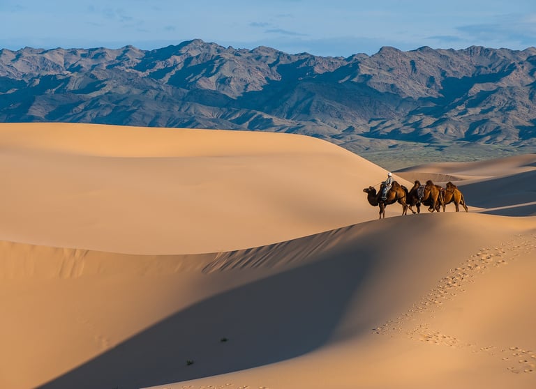 This journey takes you across Mongolia from south to north, showcasing the country’s cultural heritage and dramatic natural contrasts. We begin in the Gobi Desert, a 1.3 million sq km region known for extreme seasons and world-famous dinosaur fossils. Here you will visit the discovery sites from the 1920s, explore Tsagaan Suvarga, climb towering 300-meter dunes, enjoy camel rides, and see the remains of ancient desert temples.