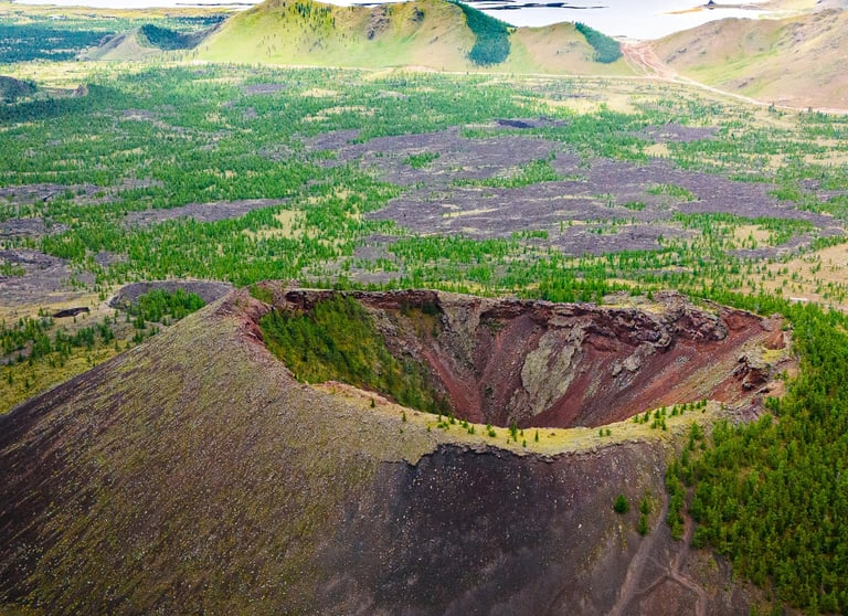Khorgo Terkhiin Tsagaan National Park is known for its alpine scenery, extinct volcanoes, and the freshwater Terkhiin Tsagaan Lake formed by ancient lava flows. The area is home to nomadic families and vast pasturelands.