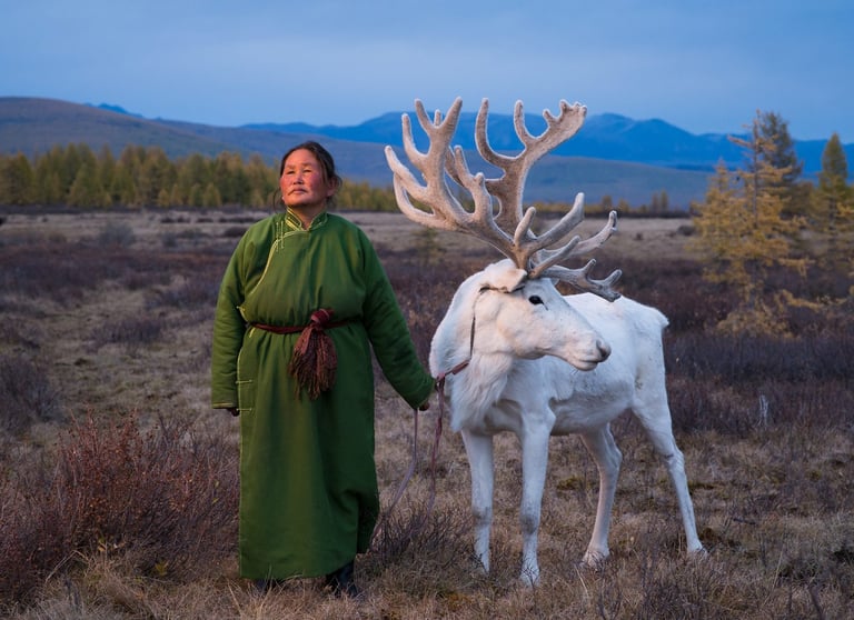 The taiga forest's depths are home to the Reindeer Tsaatan people. The main source of their income is a small number of reindeer. To augment their income, some families of reindeer relocate from the Taiga highlands near the lake throughout the summer. We will go see the reindeer folks and take photos with them after breakfast. The rest of the day will be spent riding horses around the lake's beach and climbing a nearby mountain to get a higher view of the lake before we travel back to the ger camp for lunch. Ger camp lodging; breakfast, lunch, and dinner